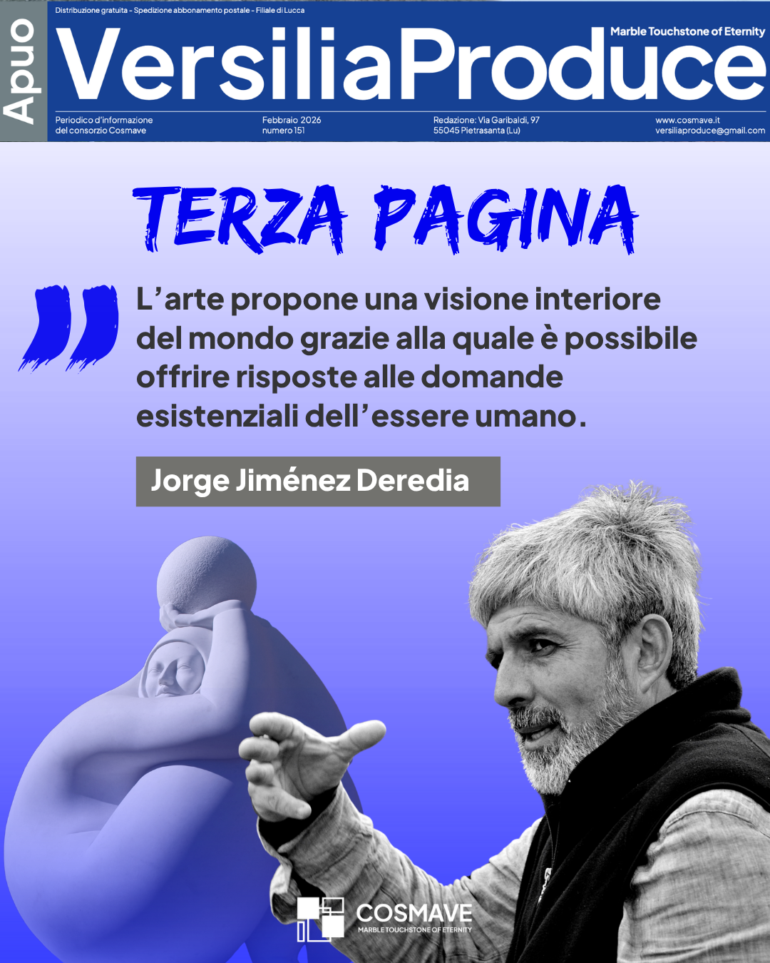 Dei suoi 71 anni, Jiménez Deredia ne ha trascorsi circa 50 lavorando nei laboratori di marmo e bronzo tra Pietrasanta e Carrara. Lo scultore costaricano è tra i nomi più rilevanti nel panorama internazionale: abbandonato il figurativismo classico, la sua produzione è apprezzata dal pubblico e dalla critica, all’insegna del cosiddetto Simbolismo Trasmutativo. Deredia collabora attualmente con oltre trenta gallerie in tutto il mondo, da New York a Miami, Londra e Parigi. A lui è dedicata l’intervista in Terza Pagina del periodico VersiliaProduce di Febbraio.